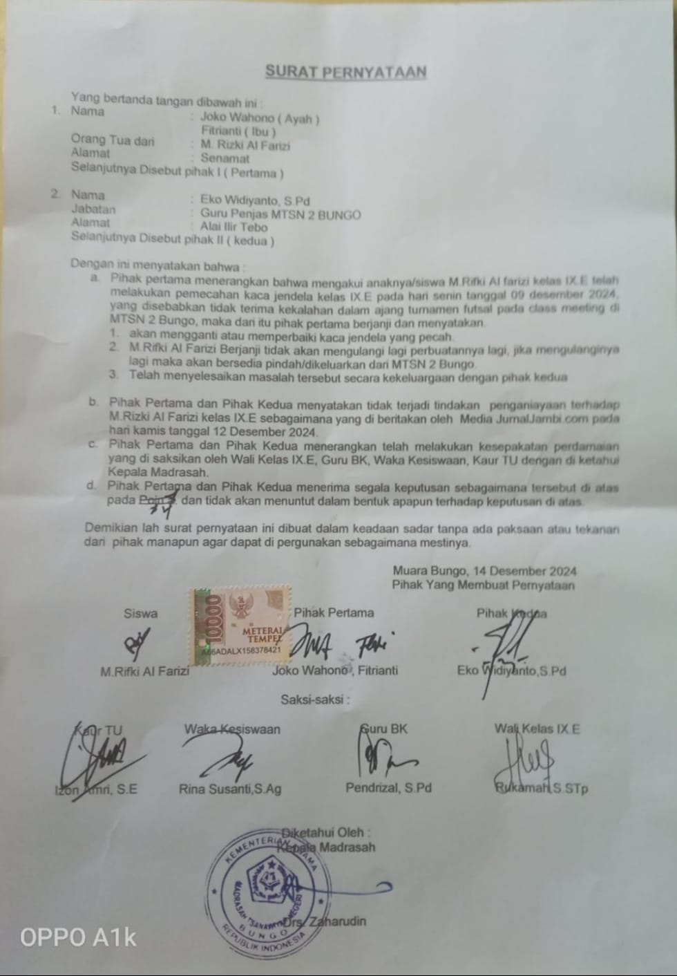 Dalam isi surat perjanjian tersebut pada point’ b, di nyatakan bahwa pihak pertama dan pihak kedua menyatakan tidak terjadi penganiayaan terhadap M Rizky Al Farizi kelas IX E sebagaimana yang diberitakan oleh media jurnaljambi.com pada hari Kamis tanggal 12 Desember 2024.