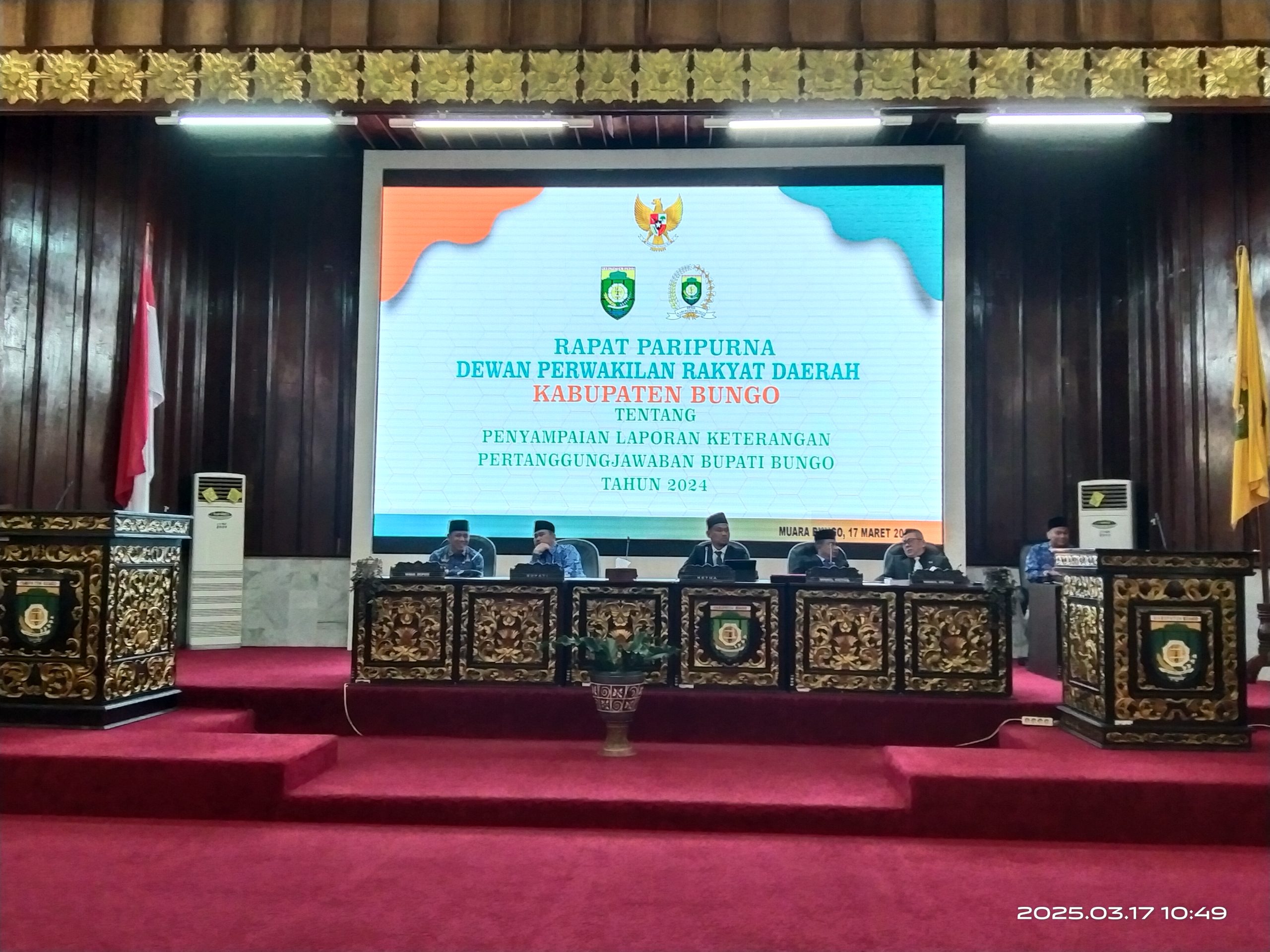 BUNGO , JURNALJAMBI.COM – Dewan Perwakilan Rakyat Daerah Kabupaten Bungo Menggelar Rapat Paripurna Penyampaian Laporan Keterangan Pertanggungjawaban Bupati Bungo Tahun 2024. Senin , (17/3/25)
