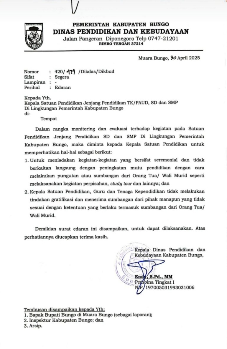Hal ini juga sudah ditegaskan oleh Endi S.Pd., MM selaku Kepala Dinas Pendidikan dan Kebudayaan Kabupaten Bungo, dalam surat edaran nya tertanggal 30 April 2025 di tekan kan bahwa Dalam rangka monitoring dan evaluasi terhadap kegiatan pada Satuan Pendidikan Jenjang Pendidikan 8D dan SMP Di Lingkungan Pemerintah Kabupaten Bungo, maka diminta kepada Kepala Satuan Pendidikan untuk memperhatikan hal-hal sebagai berikut: