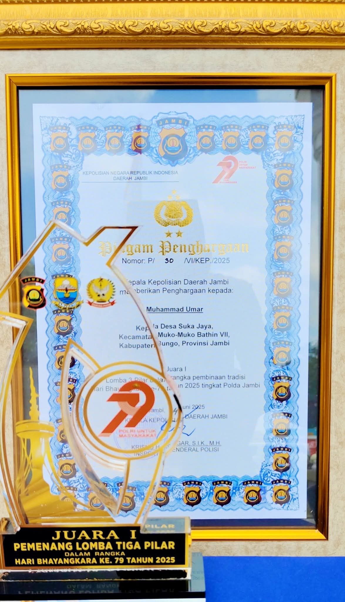Bungo, Jurnaljambi.com – Rio Dusun Suka Jaya, Bhabinkamtibmas dan Babinsa Suka Jaya Kecamatan Muko Muko Bathin VII Mendapat Juara 1 Lomba 3 Pilar dalam Rangka Pembinaan Tradisi Hari Bhayangkara Ke 79 tahun 2025 Tingkat Polda Jambi.