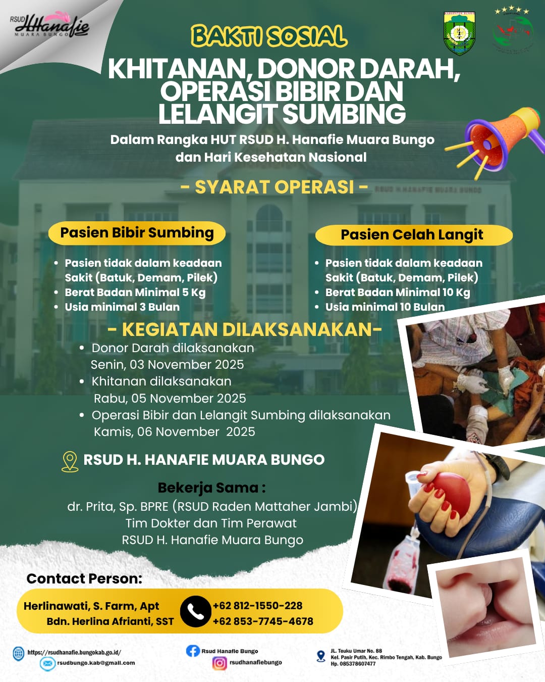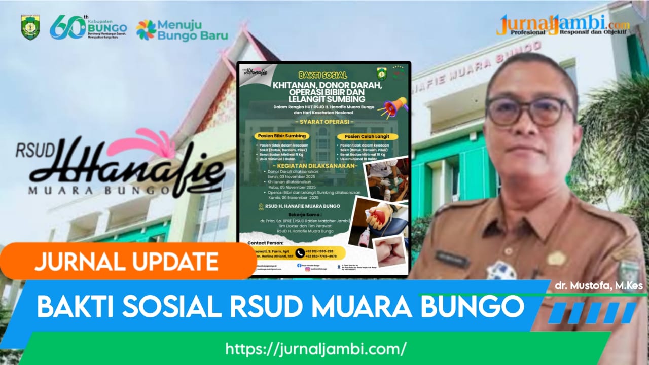 Kegiatan sosial ini mencakup donor darah, khitanan massal, serta operasi bibir dan lelangit sumbing, yang akan dilaksanakan secara gratis di lingkungan RSUD H. Hanafie Muara Bungo.