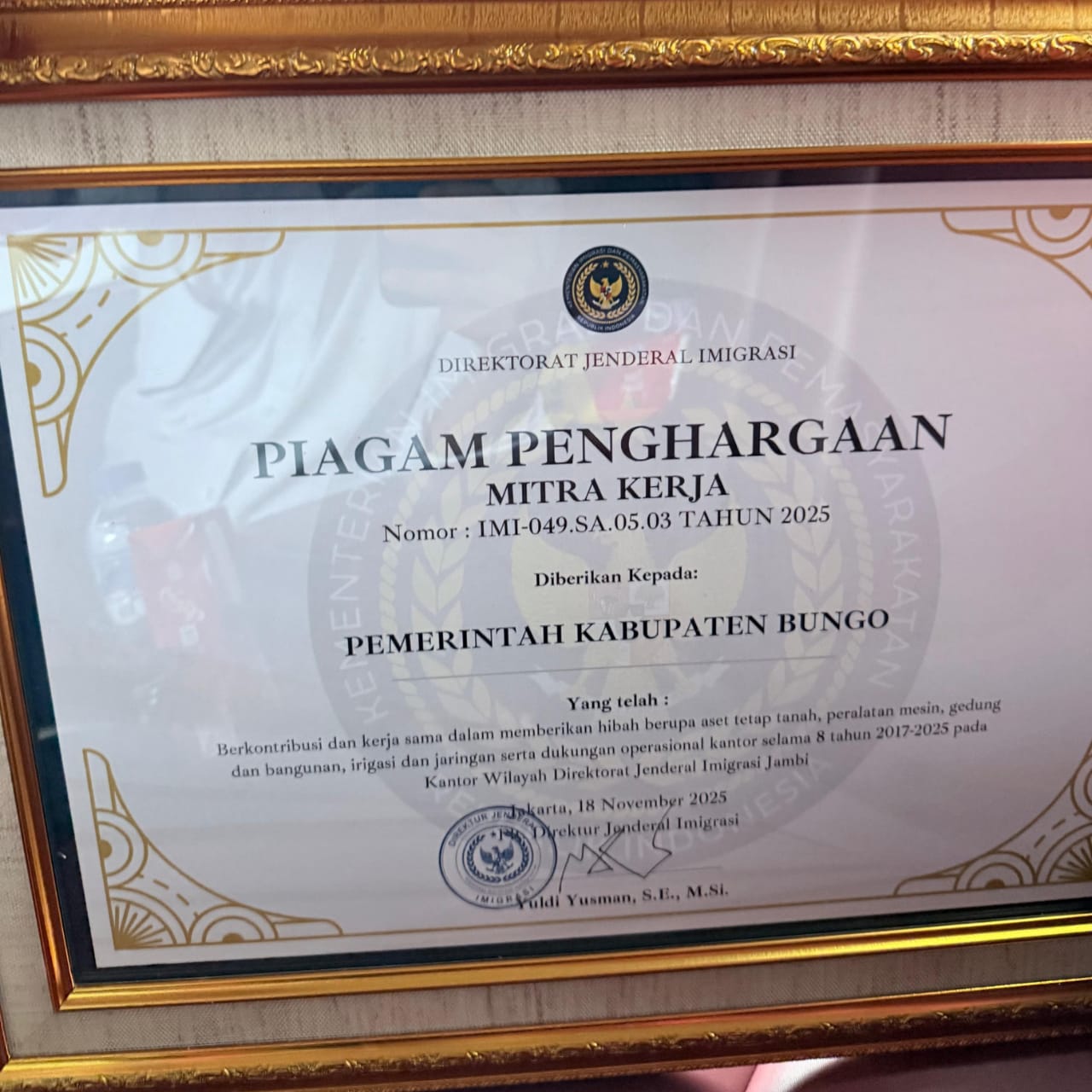 Penghargaan ini diberikan sebagai bentuk apresiasi atas dukungan dan sinergitas Pemkab Bungo dalam pelayanan keimigrasian dan pemasyarakatan di wilayah Jambi.