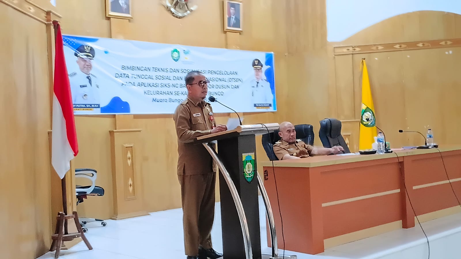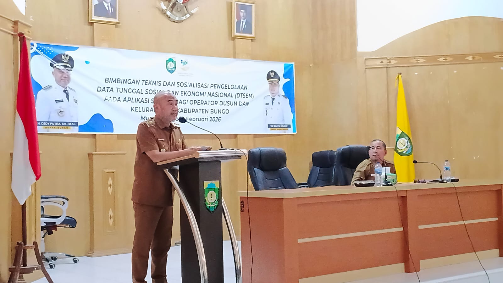 Bungo. Jurnaljambi.com – Bupati Bungo, H. Dedi Putra, SH, M.Kn, secara resmi membuka kegiatan Bimbingan Teknis (Bimtek) dan Sosialisasi Pengelolaan Data Tunggal Sosial dan Ekonomi Nasional (DTSEN) melalui aplikasi SIKS-NG bagi operator dusun dan kelurahan se-Kabupaten Bungo, Senin (9/2/2026).