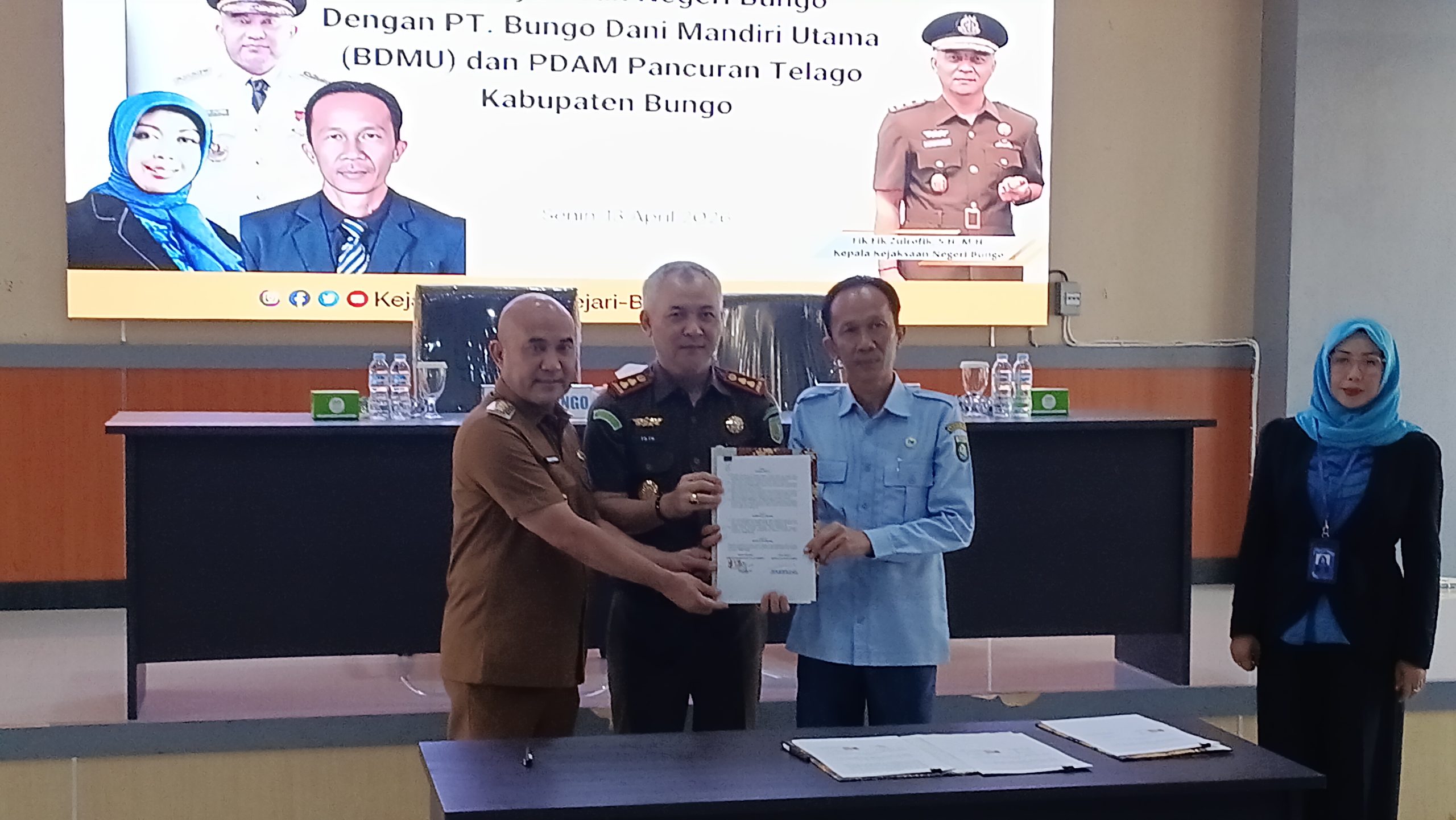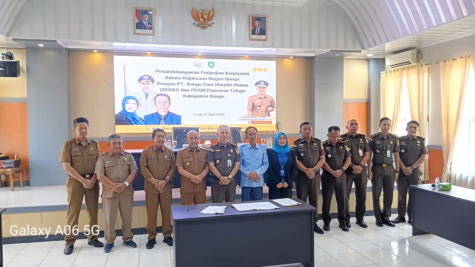 Bungo, Jurnaljambi.com – Kejaksaan Negeri Bungo resmi melakukan penandatanganan perjanjian kerja sama dengan PT Bungo Mandiri Utama (BDMU) dan PDAM Pancuran Telago Kabupaten Bungo. Kegiatan ini bertujuan memperkuat sinergi dalam bidang hukum, tata kelola perusahaan, serta peningkatan pelayanan kepada masyarakat. Senin, (13/4/26)